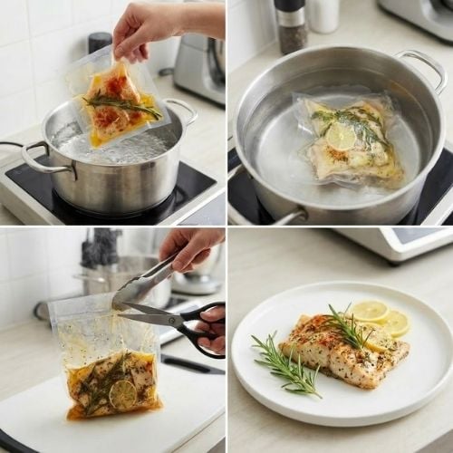 Bez rozmrazování vložte sáček s rybou do horké vody a ohřejte. Hotovo během pár minut – bez ztráty kvality.