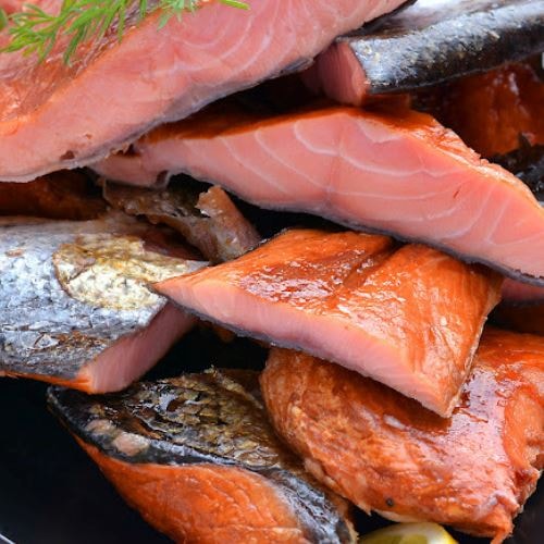 Nestandard steak s kůží z norského lososa, uzený teplým kouřem. Steak byl před uzením marinovaný ve směsi koření. Hluboce zmrazeno. Balení může obsahovat malé kousky, potrhané a zlámané kusy steaků, břišní a ocasní části.
