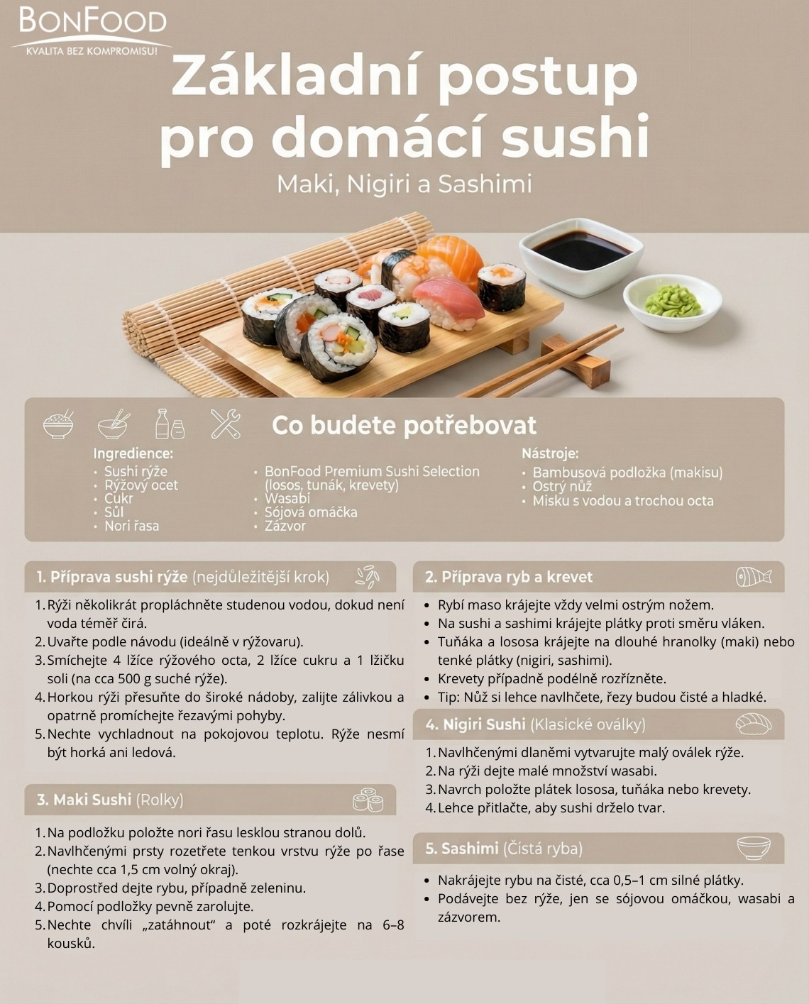 BonFood Prémiový sushi výběr je ideální základ pro domácí sushi, sashimi, poke bowls i moderní studenou kuchyni. Prémiové suroviny, které běžně používají profesionálové, jsme vybrali a spojili do jednoho balíčku, abyste se mohli soustředit už jen na samotný zážitek.