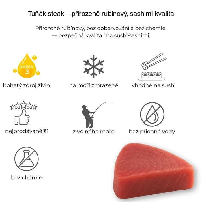 Tuňák steak jsou neuvěřitelně univerzální. Ať už je grilujete, smažíte, nebo připravujete na pánvi, jejich chuť Vás vždy překvapí svou jemností. Připravte si japonské sushi, středomořský salát nebo poke bowls.
