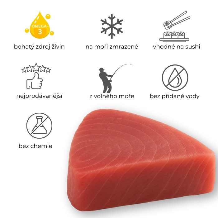 Na pultech obchodů často vidíte krásné, sytě červené kusy tuňáka označené jako sushi nebo sashimi kvalita. My nabízíme tuňáka, který má po zmražení přirozeně čokoládově hnědou barvu – protože je skutečně kvalitní, rychle zmražený přímo na moři. Někteří zákazníci ale žádají „ten super červený“, aniž tuší, jak vzniká.